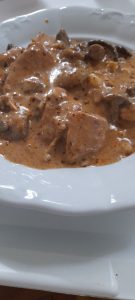 Amíg puhul a hús, a tejfölt elkeverjük a keményítővel. Ha kész a hús hozzáadjuk a lisztes tejfölt. Rottyantunk rajta egyet és visszatesszük a lepirított gombát. Kötelező körete a galuska. Tejföllel és petrezselyemmel tálaljuk.