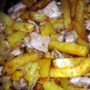 A burgonyát meghámozzuk, majd vagy kockára, vagy hasábra vágjuk, és bő, forró olajban pirosra sütjük. Mikor kiszedtük és lecsepegtettük, összekeverjük a pecsenyével.