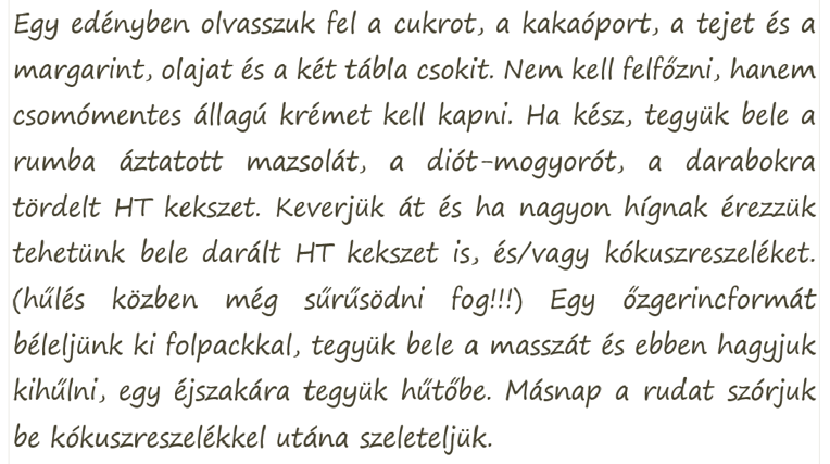 - Keverjük át és ha nagyon hígan érezzük, tehetünk bele darált HT-kekszet is, és/vagy kókuszreszeléket. (Hűlés közben még sűrűsödni fog!!)