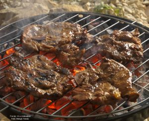 A hagymát, krumplit karikákra vágjuk. Nagy hőálló tálat kivajazunk, egy sor krumplit teszünk bele (alá mehet egy sor bacon is), sózzuk, borsozzuk. Egy sor hagyma, majd a hús, só és bors jön rá, meg mustár. Ismét krumpli, és addig rétegezzük, míg van mit. Tetejére krumpli kerül, rá bors, pirospaprika, és baconszeletek.