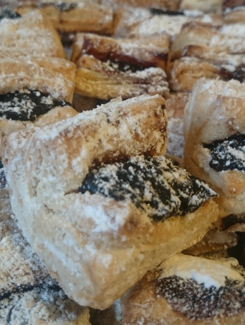 Ezután a tésztát kb fél cm vastagra és négyzet formára nyújtjuk, majd egyenlő méretű négyzetekre vágjuk. (kb 10*8 cm) Erre megy a szilvalakrvár, vagy esetleg dió töltelék. Összehajtjuk a kis négyzeteket, tepsibe rakjuk őket. Nézzenek egy irányba, és úgy tegyük majd be a sütőbe hogy a vágott oldala a sütő belseje felé nézzen. A leveles szerkezet azáltal alakul ki, hogy a vékonyra nyújtott HIDEG tésztarétegek közötti zsír a sütés alatt megolvad, és megakadályozza a rétegek összetapadását. A sülés közben a tészta és a zsír víztartalma gőzzé alakul, szétfeszítve és fellazítva a rétegeket. Ezért FORRÓ! 220 fokra melegített sütőben kell sütni, szép arany színűre. Kb 10-15 perc. Ha légkeverés is van a sütőn az jól jöhet. Ha kihűlt porcukorral megszórva tálaljuk.