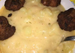 A felkockázott krumplit feltesszük főni a babérral, sóval, borssal ízesített vízben. Vegetát adunk hozzá. Ha megfőtt mehet bele a tejföl, majd a vízben feloldott liszt.