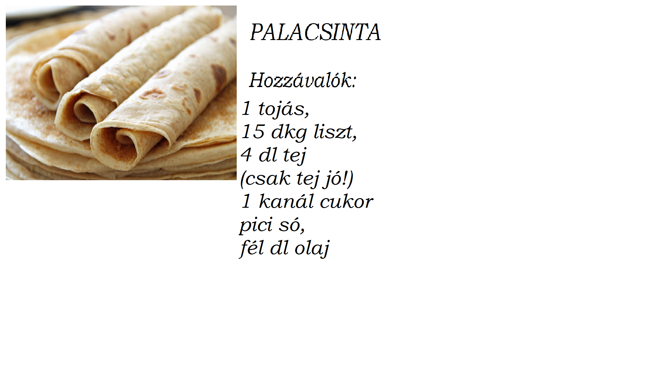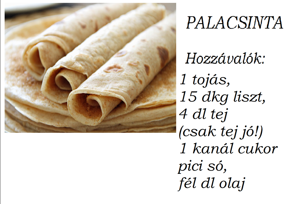 Palacsinta március 14, 2026május 26, 2024 Szerző: Kapi Tünde Hozzávalók 1 tojás 15 dkg liszt 4 dl tej (csak tej jó!) 1 kanál cukor pici só fél dl olaj Elkészítési mód Az elkészítési mód nem szerepel a képen.