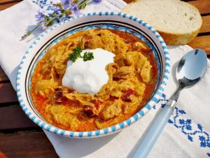 A savanyú káposztát közben kimossuk, a levét kinyomkodjuk. A kinyomkodott káposztát a húshoz keverjük, és annyi vizet öntünk rá, hogy majdnem ellepje. Tovább főzzük, amíg a hús és a káposzta is megpuhul, ezután tejfölös habarással behabarjuk.