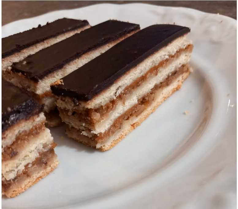 Ha teljesen kihűlt csak akkor szeleteljük fel: a szélek levágása után 4*2 cm széles szeletekre vágjuk.